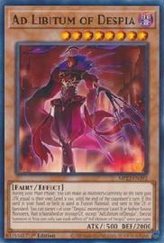 During your Main Phase You can make all monsters currently on the field gain ATK equal to their own Level x 100 until the end of the opponents turn If this card in your hand or field is used as Fusion Material and sent to the GY or banished You can target 1 of your Despia monsters or Level 8 or higher Fusion Monsters that is banished or in your GY except Ad Libitum of Despia Special Summon it You can only use each effect of Ad Libitum of Despia once per turn