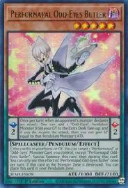 strongPendulum EffectstrongbrOnce per turn when an opponents monster declares an attack You can add 1 OddEyes Pendulum Monster from your GY to the Extra Deck faceup and if you do negate the attack then you can gain LP equal to that Pendulum Monsters ATKbrstrongMonster EffectstrongbrIf this card is in your hand or GY You can target 1 Performapal or OddEyes Monster Card you control except Performapal OddEyes Butler Special Summon this card then destroy that card You can only use this effect of Per